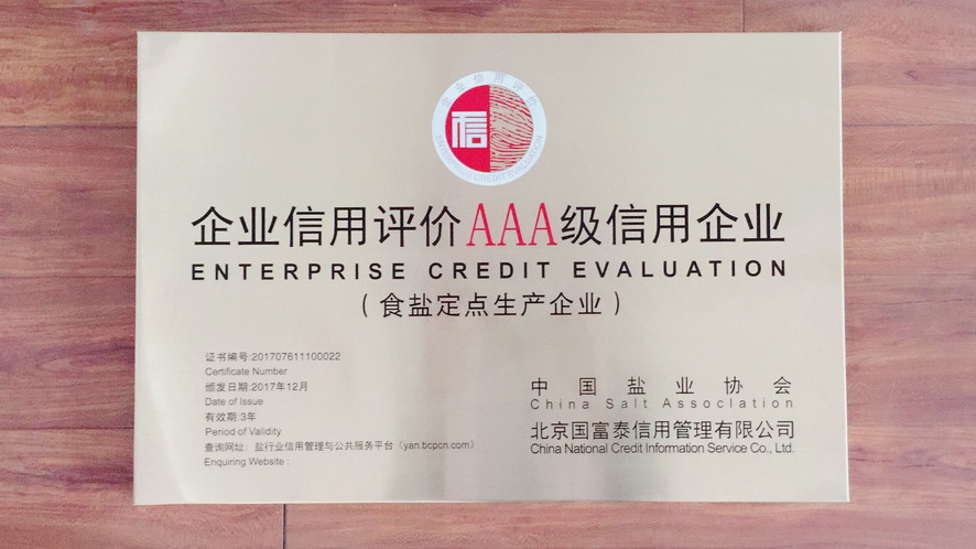 按照主營(yíng)業(yè)務(wù)收入、利潤(rùn)、主營(yíng)業(yè)務(wù)收入利稅率及主營(yíng)業(yè)務(wù)增速四項(xiàng)指標(biāo)評(píng)價(jià),2016年集團(tuán)公司被中國(guó)輕工業(yè)聯(lián)合會(huì)和中國(guó)鹽業(yè)協(xié)會(huì)評(píng)為中國(guó)輕工業(yè)制鹽行業(yè)十強(qiáng)企業(yè)。根據(jù)《社會(huì)信用體系建設(shè)規(guī)劃綱要(2014—2020)》,經(jīng)第三方專業(yè)評(píng)價(jià)機(jī)構(gòu)和中國(guó)鹽業(yè)企業(yè)信用等級(jí)評(píng)價(jià)委員會(huì)審核并向社會(huì)公示,2016年江蘇金橋制鹽有限公司被評(píng)為AAA級(jí)食鹽生產(chǎn)企業(yè)。