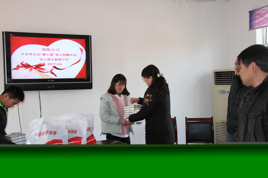 3月6日下午,利海公司按連云區(qū)“學(xué)雷鋒志愿服務(wù)月”活動(dòng)內(nèi)容,主動(dòng)聯(lián)系板橋中學(xué),了解到有部分貧困學(xué)生的實(shí)際困難后,積極與學(xué)校開展圓夢(mèng)“微心愿”活動(dòng),為他們送去棉衣與書籍等學(xué)生們心中的“微心愿”。