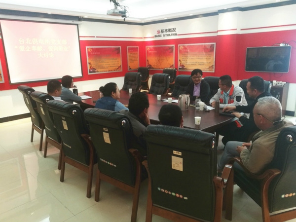 臺(tái)北供電所黨支部在5月25日召開“愛企奉獻(xiàn)、愛崗敬業(yè)”主題討論會(huì),結(jié)合經(jīng)理助理徐磊、集團(tuán)勞模于廣兵等優(yōu)秀黨員親身講解先進(jìn)事跡,廣泛征求生產(chǎn)經(jīng)營、改革發(fā)展的好辦法、好建議,組織黨員干部直面問題、凝聚共識(shí),為企業(yè)健康發(fā)展建言獻(xiàn)策。(錢明華)