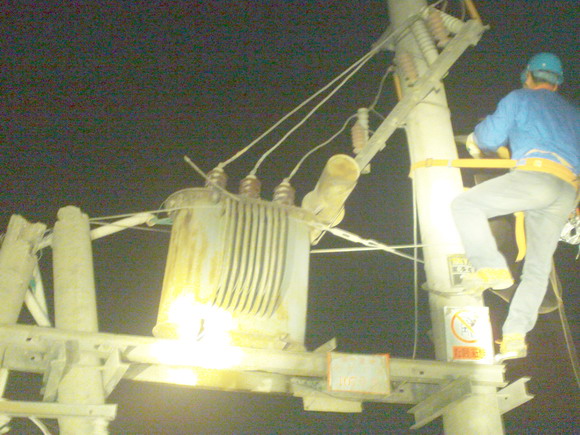 徐圩供電所立即派搶修人員趕到現(xiàn)場(chǎng)。海通攪拌站廠區(qū)事故現(xiàn)場(chǎng),高壓桿傾斜,低壓桿折斷,變壓器高低壓樁頭全部歪曲,損壞嚴(yán)重,夜間無(wú)法修復(fù)。為盡快使其它線路恢復(fù)供電,搶修人員黑夜進(jìn)行應(yīng)急處理,折除了變壓器高壓引線,并作了妥善的安全保障。同時(shí),加緊準(zhǔn)備搶修材料、電桿及變電設(shè)備。