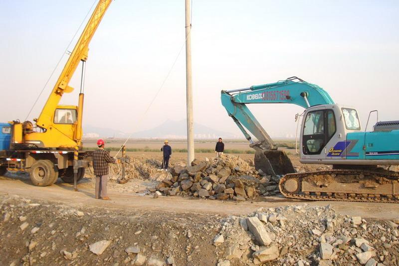 日前,臺(tái)北供電所承接的中交一航二公司向海灘延伸供電線路工程開(kāi)工建設(shè)。中交一航二公司擔(dān)負(fù)著新港城圍海造地的重任,需要架設(shè)3公里10千伏高壓線路和變壓器等保障施工用電。圖為供電所工人正在架設(shè)電桿。(李吉成)