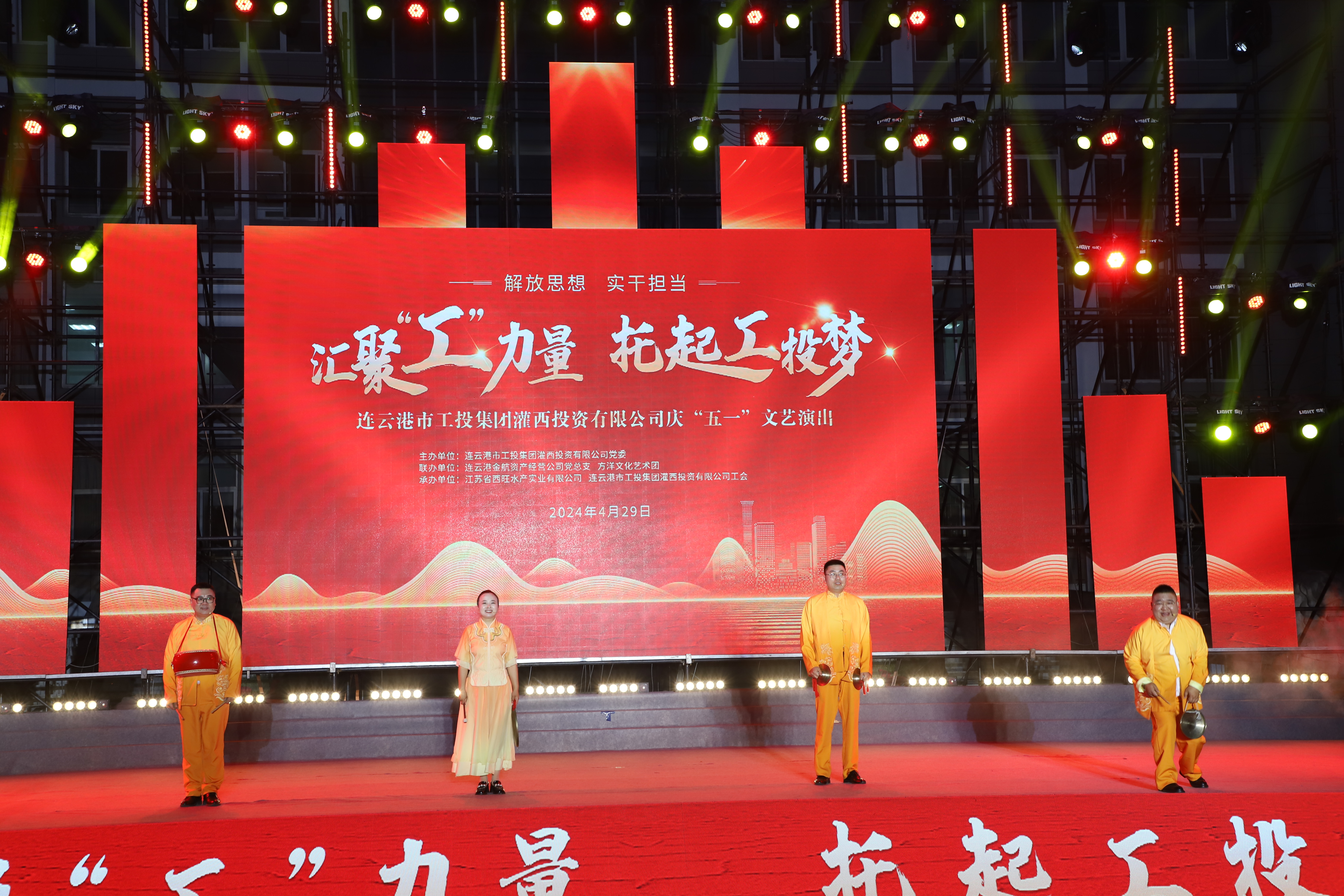 4月29日晚,灌西投資公司《匯聚“工”力量,托起工投夢(mèng)》慶“五一”文藝演出在機(jī)關(guān)大樓前廣場(chǎng)舉行。本次活動(dòng)由灌西投資公司黨委主辦,連云港金航資產(chǎn)經(jīng)營(yíng)公司黨總支、方洋文化藝術(shù)團(tuán)聯(lián)辦,旨在通過(guò)藝術(shù)的形式,營(yíng)造崇尚勞模、學(xué)習(xí)先進(jìn)、尊重勞動(dòng)的良好氛圍,豐富公司員工的文化生活,激發(fā)干事創(chuàng)業(yè)熱情。集團(tuán)公司領(lǐng)導(dǎo)張六林、戴鴻鳴、汪群及部分部門負(fù)責(zé)人,灌西、金航資產(chǎn)經(jīng)營(yíng)公司領(lǐng)導(dǎo)班子成員出席演出活動(dòng),縣臨港產(chǎn)業(yè)區(qū)管委會(huì)、華能灌云清潔能源發(fā)電責(zé)任有限公司、徐圩新區(qū)方洋集團(tuán)等有關(guān)領(lǐng)導(dǎo)受邀觀看演出。