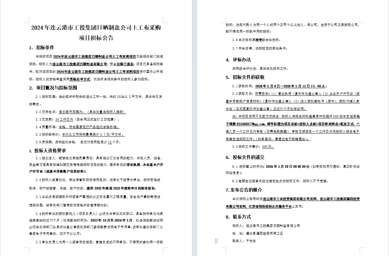 2024年連云港市工投集團日曬制鹽公司土工布采購項目招標(biāo)公告