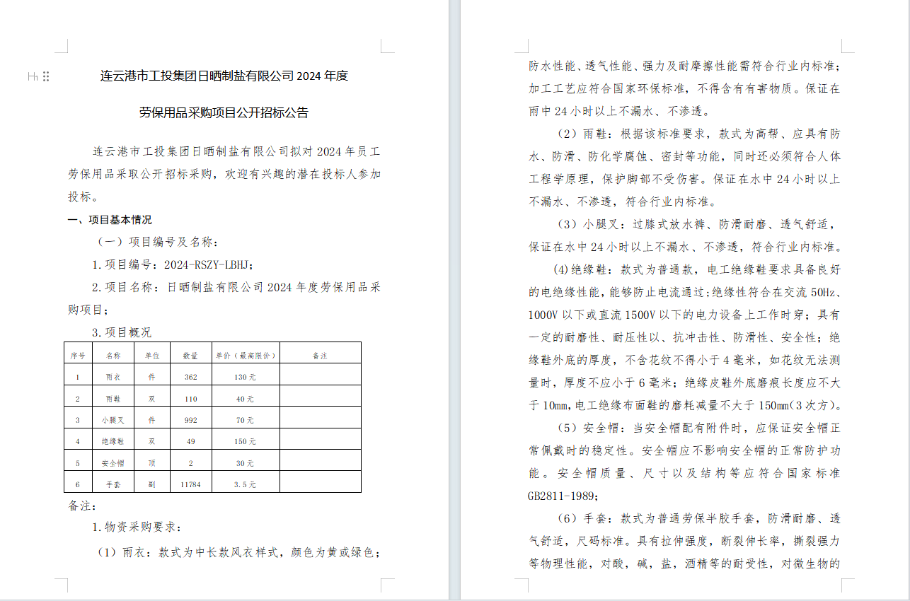 連云港市工投集團(tuán)日曬制鹽有限公司2024年度勞保用品采購(gòu)項(xiàng)目公開(kāi)招標(biāo)公告