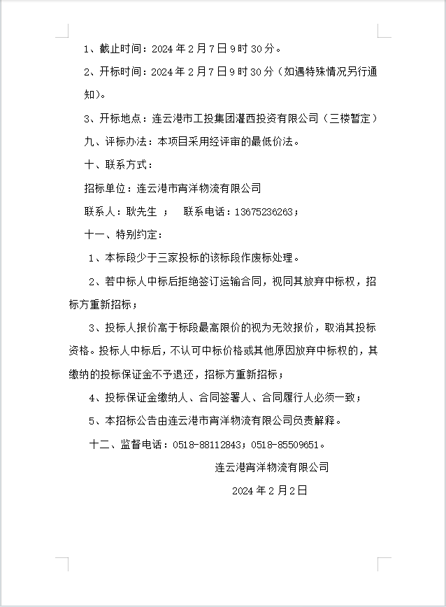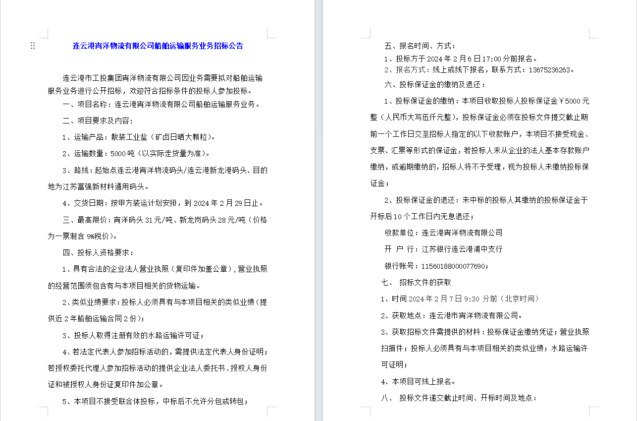 連云港宵洋物流有限公司船舶運(yùn)輸服務(wù)業(yè)務(wù)招標(biāo)公告
