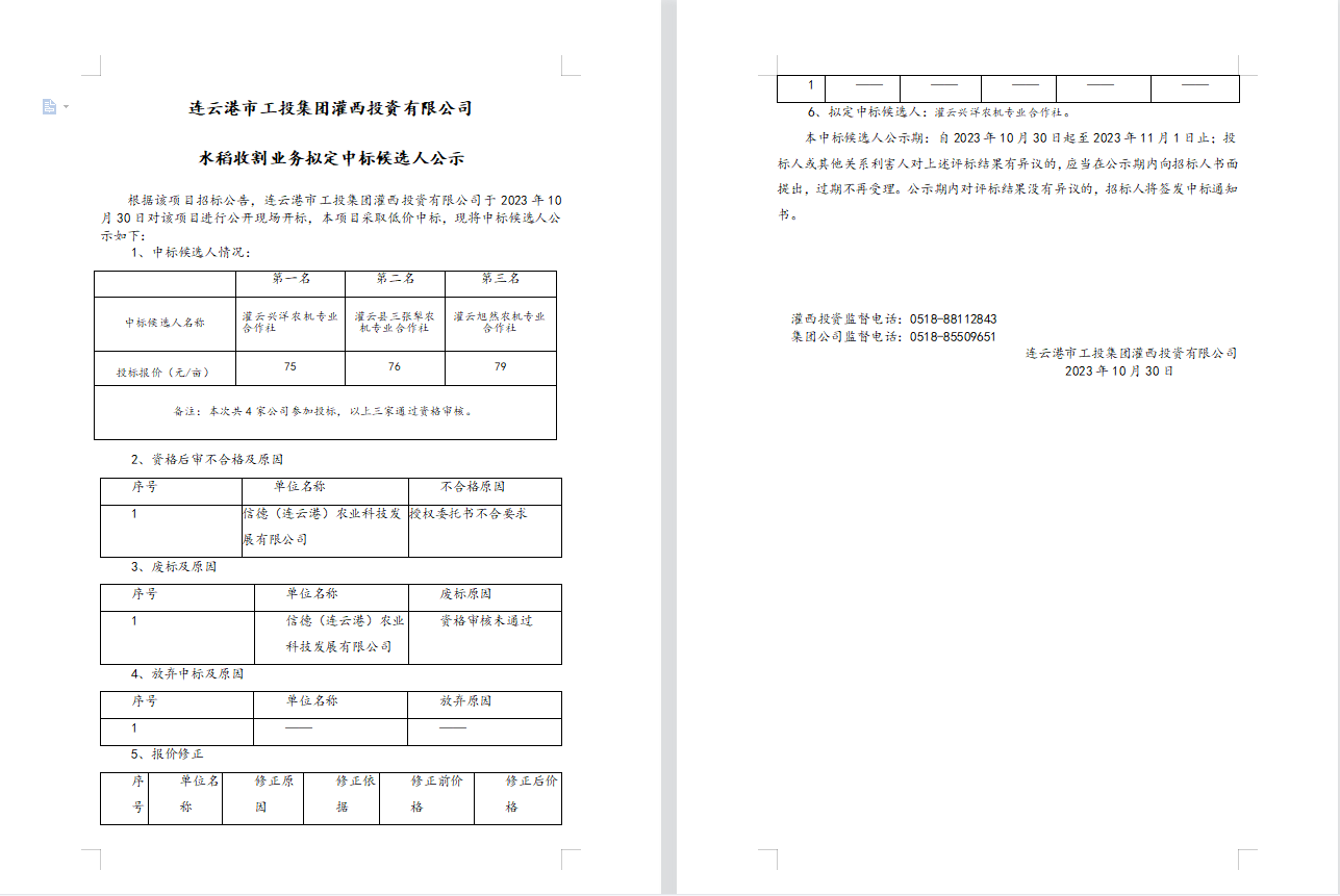 連云港市工投集團灌西投資有限公司水稻收割業(yè)務擬定中標候選人公示