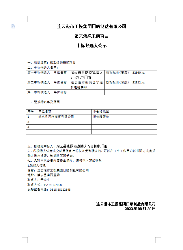 連云港市工投集團(tuán)日曬制鹽有限公司聚乙烯繩采購項(xiàng)目中標(biāo)候選人公示