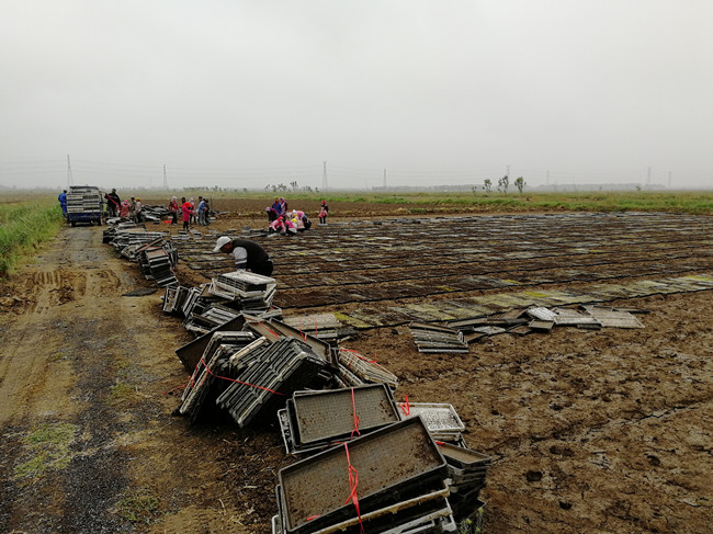 五月是水稻育秧落谷的黃金周期,大新農(nóng)場搶抓農(nóng)時迅速行動,育秧工作全面鋪開,田頭播地龍和暗化育秧同時進行。5月4日,一分場四隊率先暗化秧擺盤,條田工自發(fā)組織“運秧”車隊,將大棚暗化秧盤運至田頭進行擺盤。截止目前,自營農(nóng)田育秧已播156700盤。(大新農(nóng)場)