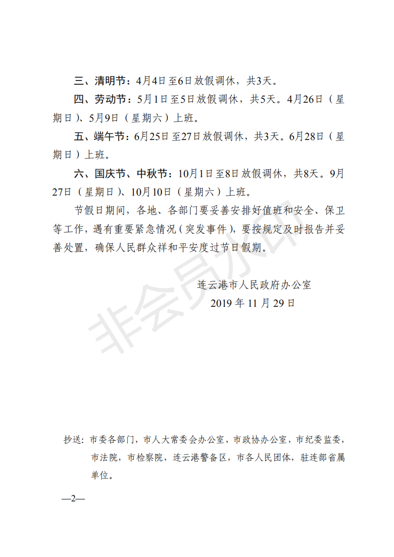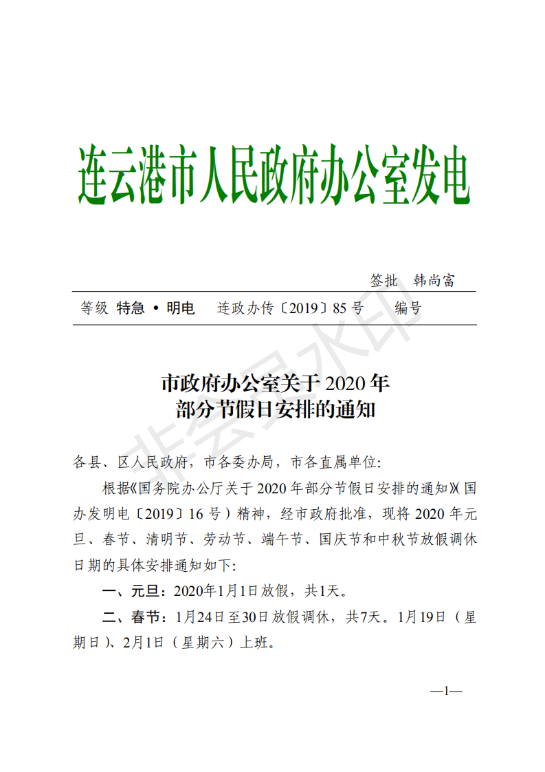 市政府辦公室關(guān)于2020年部分節(jié)假日安排的通知