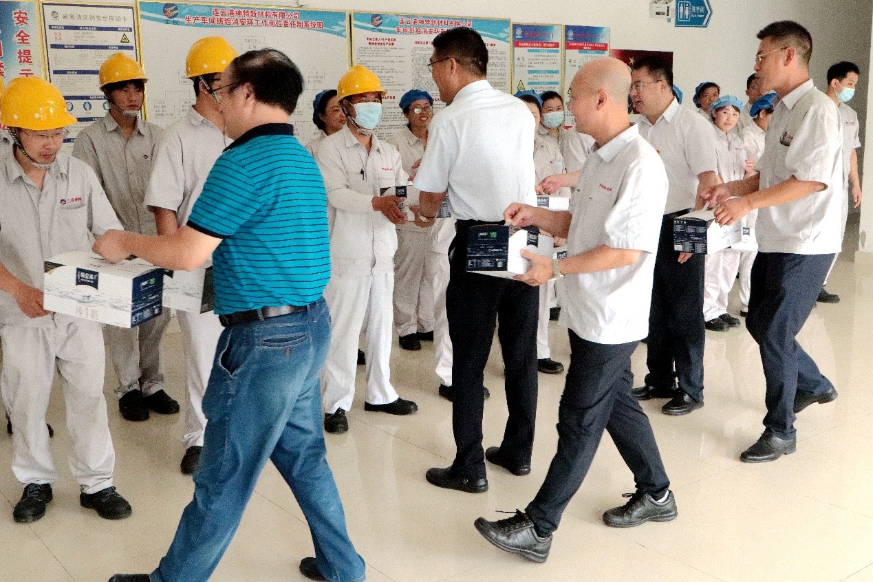 728日上午,集團(tuán)公司黨委副書記戴鴻鳴、工會主席劉承志一行到公司慰問生產(chǎn)一線員工,為生產(chǎn)一線員工送來牛奶、綠豆、白糖、大米等防暑降溫慰問品。公司董事長張斌、總經(jīng)理韓立新等領(lǐng)導(dǎo)陪同。