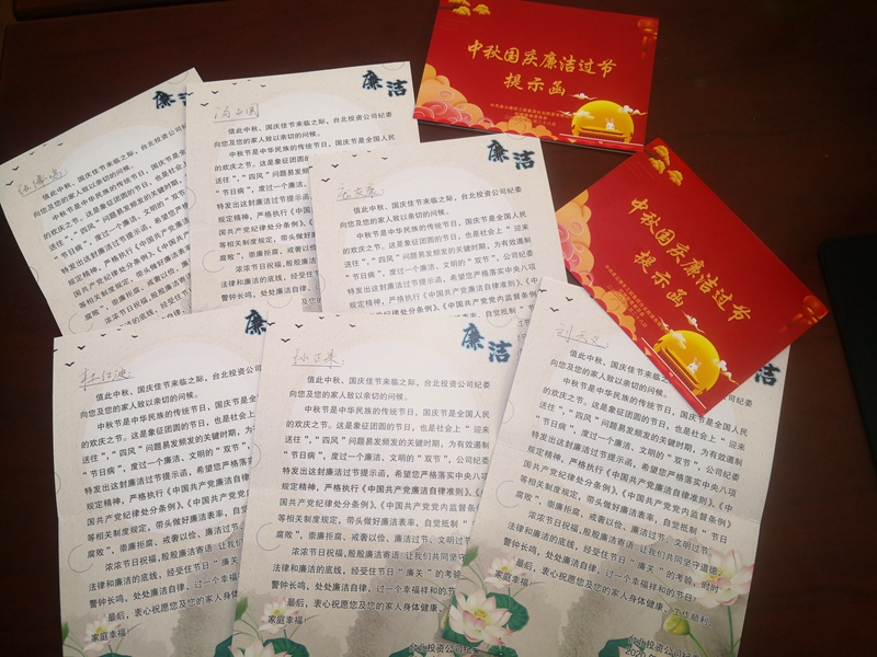 溫馨提示函早提醒。“值此中秋、國慶佳節(jié)來臨之際,臺北投資公司紀(jì)委向您和您的家人致以親切的問候……時時警鐘長鳴,處處廉潔自律,過一個幸福祥和的節(jié)日!”節(jié)前,公司通過廉潔提示函向黨員領(lǐng)導(dǎo)干部贈送節(jié)日廉潔提醒,將廉潔過節(jié)的紀(jì)律要求融入節(jié)日祝福。