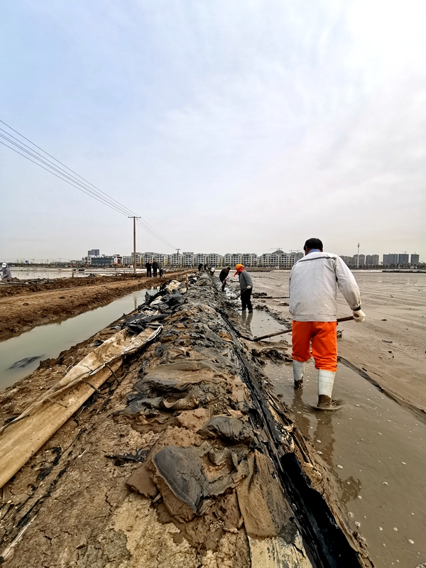 簡單交流后得知,東灘4組要趕在月底之前,將原來用作復(fù)曬的格塊重新改為結(jié)晶池,搶抓旺季增加產(chǎn)量,而東灘人員少,工作量大,僅憑現(xiàn)有的10余名職工,等改造完了灘地,可能就已進(jìn)入了雨季,無奈之下請海州灣公司伸出援手。