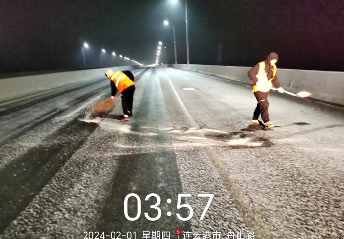截止早上7點,悅升公司共出動機械設備10臺、人員260余人,對橋梁和重點結冰地段使用融雪劑150余噸,及時消除路面冰凍隱患100余處。